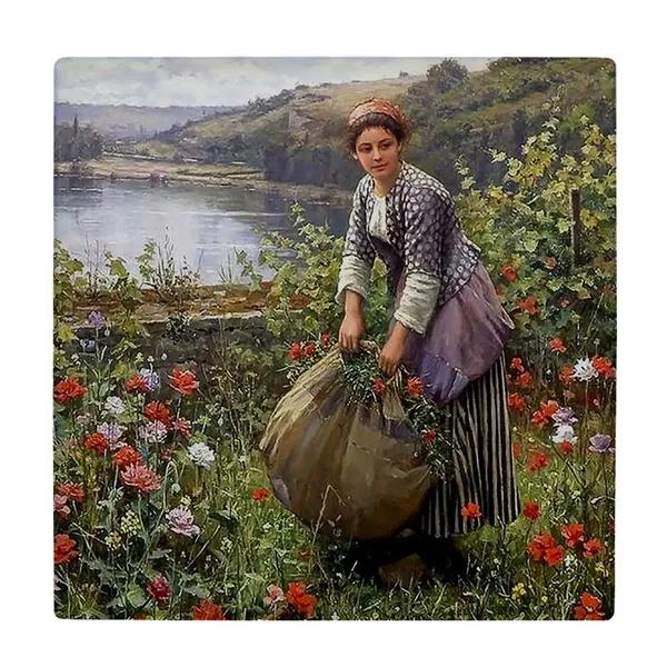 کاشی کارنیلا طرح نقاشی زن روستایی در دشت گل کد k8899